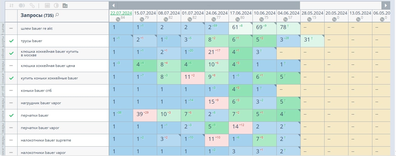 Изначально сайт был закрыт от индексации и соответственно процент запросов в топ-10 составлял 0%. На сегодняшний день мы имеем 84% в топ-10 и 71% в топ-3: